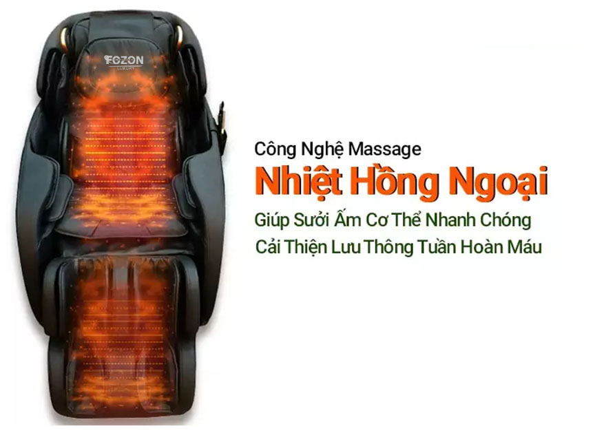 Mát xa điểm và nhiệt hồng ngoại luân phiên nhau, tăng cường khí huyết lưu thông, cải thiện chức năng tuần hoàn máu. Ghế massage có khả năng tạo ra nhiệt hồng ngoại thay đổi linh hoạt, phù hợp với thể trạng cơ thể của từng người, hoặc từng khu vực con lăn massage tác động. Khả năng mô phỏng chính xác từng chuyển động massage như bàn tay người đang xoa bóp, đấm, vỗ,…