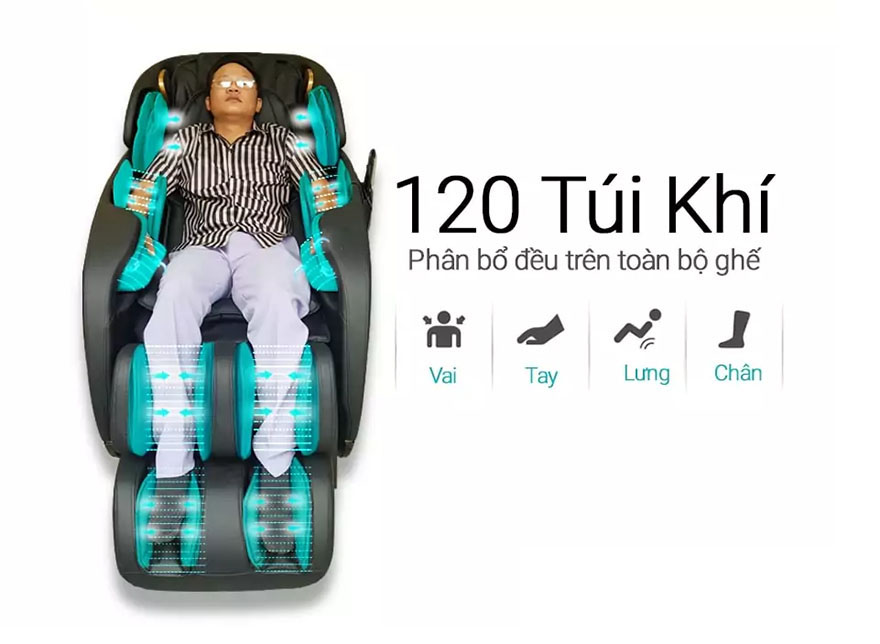 Hệ thống túi khí được phân bổ rộng khắp từ đẩu ghế tới chân ghế, hỗ trợ giảm căng cứng cơ, ngừa khô khớp. Nhờ công nghệ lắp ráp hiện đại, cho phép chiếc ghế massage này thực hiện các chuyển động bơm và nhả khí nhịp nhàng, đều đặn, không gây khó chịu cho người dùng.